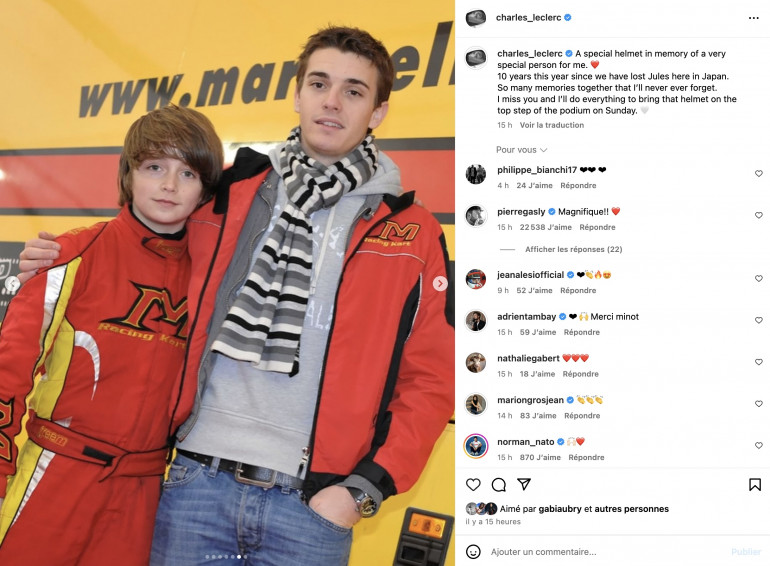 "Cela fait 10 ans que l’on a perdu Jules ici au Japon, a écrit Charles Leclerc sur son compte Instagram. Tant de souvenirs ensemble que je n’oublierais jamais. Tu me manques et je ferai tout mon possible pour amener ce casque sur la plus haute marche du podium dimanche".