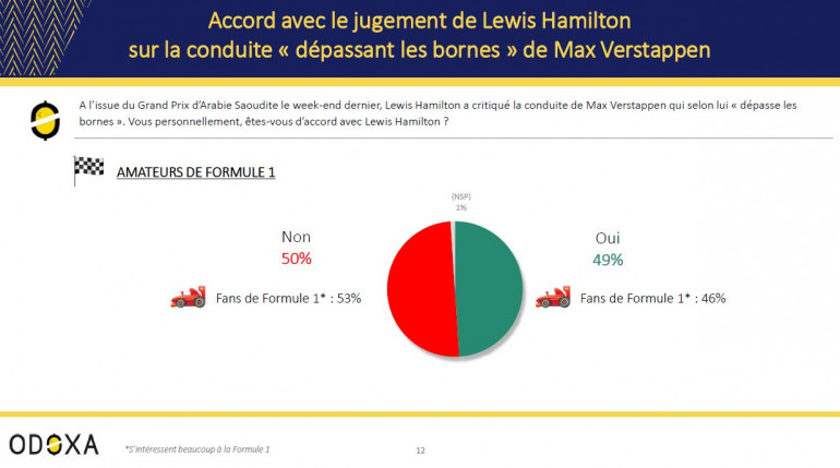 Les résultats de notre sondage montrent des amateurs de Formule 1 coupés en deux : 49% d’entre eux sont d'accord avec Hamilton, 50% pas d’accord. Notons que les fans de Formule 1 sont même légèrement plus critiques à l’égard de Lewis Hamilton : 53% d’entre eux pensent qu’il a eu tort de critiquer la conduite de Max Verstappen.