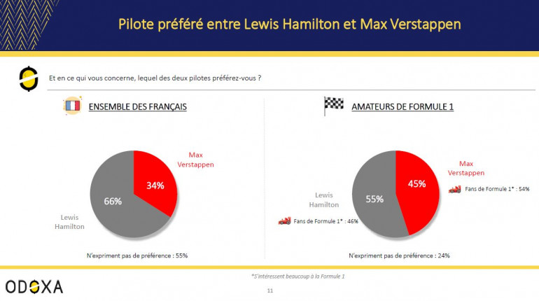 À choisir entre les deux pilotes, parmi les personnes ayant exprimé une préférence, 66% des Français préfèrent Lewis Hamilton à Max Verstappen, tout comme 55% des amateurs de Formule 1. Mais il est important de souligner que chez les fans de Formule 1 c’est le Néerlandais (54%) qui est préféré au Britannique (46%).