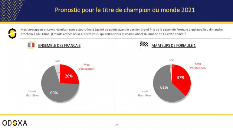 Notons que le pronostic de succès de Lewis Hamilton est donc plus réduit chez les amateurs de Formule 1 et que les avis sont même encore plus partagés auprès des fans (ceux qui s’y intéressent beaucoup) : 54% voient Lewis Hamilton l’emporter contre 44% pour Max Verstappen (2% ne se sont pas prononcés).
