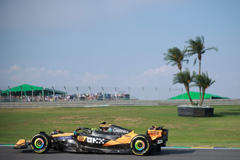 La McLaren de Lando Norris lors des qualifications de la course sprint du Grand Prix du Brésil, à Interlagos, le 7 novembre 2025