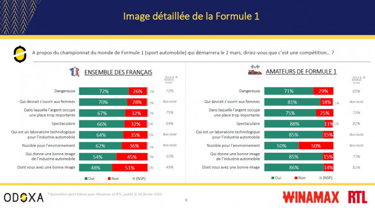 Alors que 23% des Françaises et des Français déclarent être intéressés par la saison de Formule 1 2024 qui débute samedi 2 mars à Bahreïn (2 points de moins qu'en février 2023), la reine des disciplines automobiles garde une image très contrastée : le grand public la juge aussi dangereuse (72%) que spectaculaire (66%), aussi centrée sur l’argent (67%) qu’elle est un laboratoire technologique (64%) et aussi nuisible pour l’environnement (62%) que donnant une bonne image de l’industrie automobile (54%).