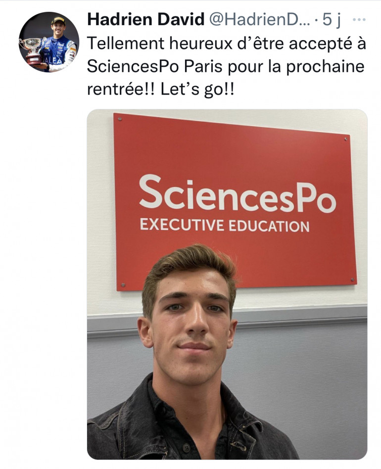"C’est dur de concilier les deux, c’est dur de dire à ses copains que le soir on ne peut pas sortir car il faut réviser ou se préparer pour une course. Mais c’est la vie que j’ai choisi. J’ai réalisé mon premier rêve, celui d’entrer à Sciences-Po. J’espère réaliser le second et être un jour en Formule 1".