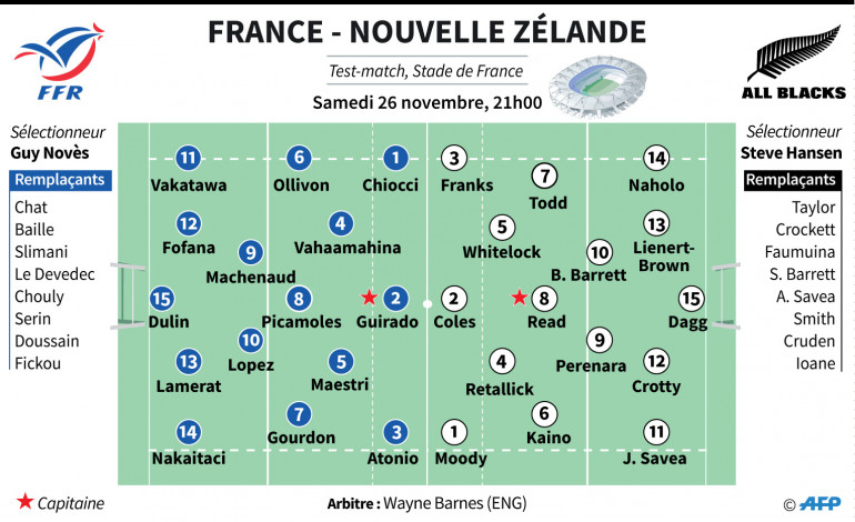 Autre changement effectué par le sélectionneur Guy Novès : Xavier Chiocci supplée Cyril Baille au poste de pilier gauche. Du côté des Blacks, Steve Hansen a été obligé de recomposer son équipe à l'arrière en raison de plusieurs blessures. Seuls l'ouvreur Beauden Barrett et l'ailier gauche Julian Savea conservent leur poste. TJ Perenara débutera à la place d'Aaron Smith en demi de mêlée.