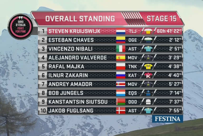 Le classement général du Giro 2016 à l'issue de la 15e étape