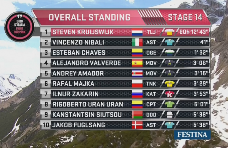 Le grand perdant du jour est Alejandro Valverde qui a vu ses chances de victoire finale s'amenuiser. Le leader de l'équipe Movistar n'a pas eu la force de suivre Kruijswijk, Chaves et Nibali, et a perdu au final 3'06" au général. Le Français Arnaud Démarre, qui n'a pas réussi à faire mieux que des 2e places au sprint, a quant à lui abandonné ce samedi. Dimanche, le contre-la montre de côte s'annonce particulièrement difficile et pourrait rabattre de nouveau les cartes dans un Giro complètement ouvert.