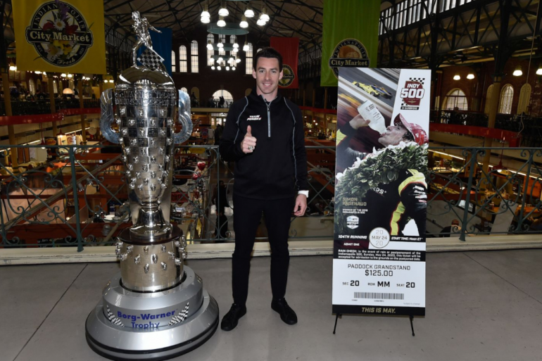Simon Pagenaud lors de la présentation du billet de l'édition 2020 des 500 miles