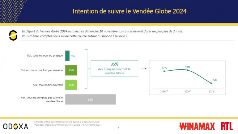 Les Français sont fascinés par leurs exploits et leur courage mais ils semblent se désintéresser de la course avec les années. D'après notre sondage Odoxa pour RTL et Winamax publié ce dimanche 3 novembre 2024, le Vendée Globe n’a plus la cote auprès des Français. Lors des éditions 2016 et 2020, 47 et 48% d’entre eux déclaraient qu’ils comptaient suivre la course. À quelques jours du départ de l’édition 2024, ils ne sont que 35%, 12 et 13 points de moins qu’en 2016 et 2020.