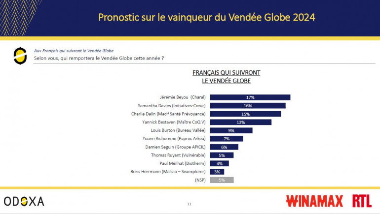 Pour cette édition, aucun nom ne se démarque encore pour être qualifié de grand favori. Jérémie Beyou (17%) devance très légèrement Sam Davies (16%) et Charlie Dalin (15%). Yannick Bestaven, le tenant du titre, arrive 4ème avec 13% des citations, devant Louis Burton (9%), Yoann Richomme (7%), Damien Séguin (6%) ou encore Thomas Ruyant (5%).