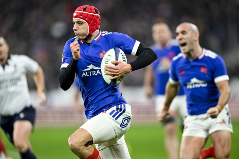 Louis Bielle-Biarrey avec le XV de France lors du match de la tournée d'automne contre l'Australie, au Stade de France le 22 novembre 2025.
