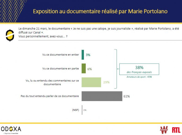 Diffusé le 21 mars sur Canal+, le documentaire de Marie Portolano, Je ne suis pas une salope, je suis journaliste a touché une part significative de la population nationale : près de quatre Français sur dix (38%) en ont entendu parler.