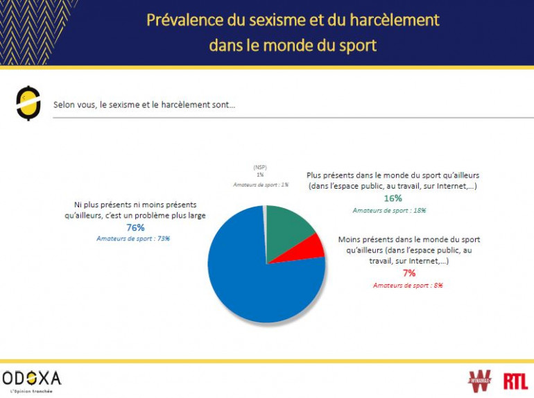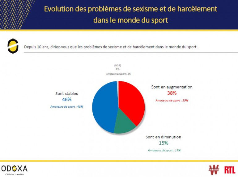 38% des personnes interrogées jugent que les problèmes de sexisme sont en augmentation dans le monde du sport, 15% qu’ils sont en diminution et 46% qu’ils sont stables. Mais pour 76% des Français, le sexisme et le harcèlement ne sont ni plus ni moins présents dans le monde du sport qu’ailleurs (dans l’espace public, au travail, sur Internet…), c'est un problème plus large.