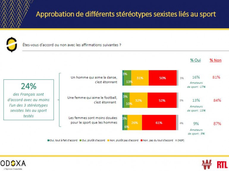 24% des Français partagent au moins un stéréotype sexiste sur le sport : pour 16% d’entre eux "un homme qui aime la danse c’est étonnant", pour 13% "une femme qui aime le football c’est étonnant" et pour 9% "les femmes sont moins douées pour le sport que les hommes". Près de quatre 4 Français sur 10 ont vu ou ont entendu parler du documentaire de Marie Portolano, Je ne suis pas une salope, je suis journaliste.