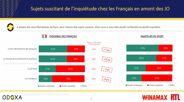 Il y a aussi un évènement dans l’évènement, la cérémonie d’ouverture, inédite en étant organisée sur la Seine. Là encore, les Français sont majoritairement confiants quant à sa réussite (61%), tout comme les amateurs de sport (65%). Mais les Français redoutent très majoritairement des difficultés dans les transports (70%) et s’inquiètent pour la sécurité lors des Jeux olympiques (63%). La défiance a augmenté sur chacun de ces critères depuis octobre dernier, en particulier s’agissant de la cérémonie d’ouverture (+10 pts), du déroulement des épreuves (+7 pts) voire des transports (+4 pts).