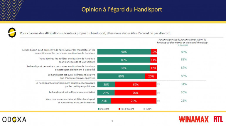 Le handisport bénéficie d’une très bonne image : il fait évoluer les mentalités pour 90% des sondés, ses athlètes sont admirés pour leur courage et leur volonté (89%), il permet aux personnes en situation de handicap de participer pleinement à la société (88%) et est aussi intéressant à suivre que d’autres épreuves (80%).