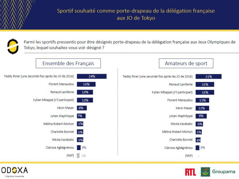 Parmi ces derniers ou parmi les sportifs pressentis pour être honorés de la sorte, les Français font un choix clair. Alors même que nous les avons avertis qu’il s’agirait de la seconde fois après 2016, ils optent à nouveau pour Teddy Riner (24%), nettement devant le nageur Florent Manaudou (15%), le perchiste Renaud Lavillenie (13%) et le footballeur Kylian Mbappé (13%).
