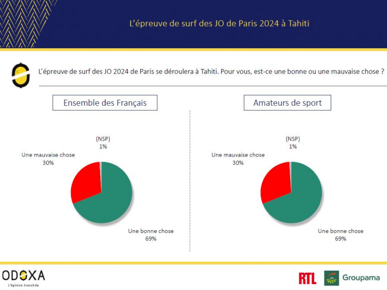 Voir l'attaquant du PSG évoluer au sein de l'équipe de France olympique : c'est justement une bonne idée pour 66% des sondés et pour 71% des amateurs de sport. Plus de deux tiers des personnes interrogées estiment aussi que l'organisation de l'épreuve de surf à Tahiti en 2024 est une bonne chose.