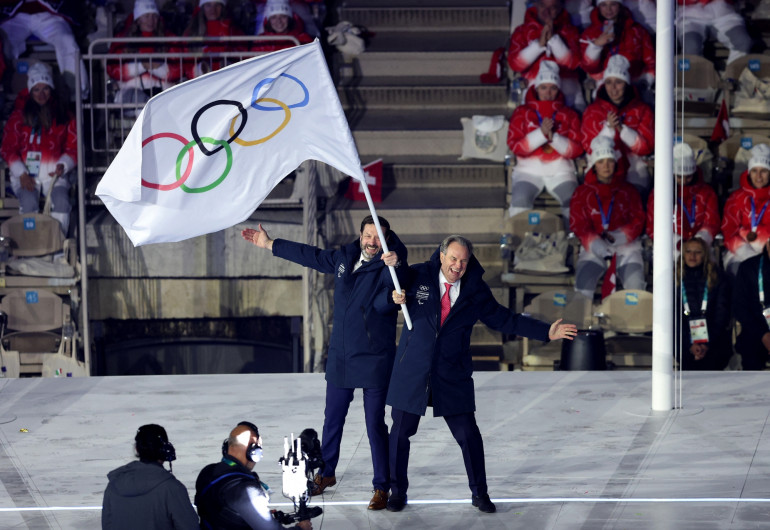 Moment-clé de la cérémonie, la transmission du drapeau olympique par l'organisation des JO de Milan Cortina et le Comité international olympique aux représentants des Alpes françaises, qui accueilleront en 2030 la prochaine édition des Jeux d'hiver.