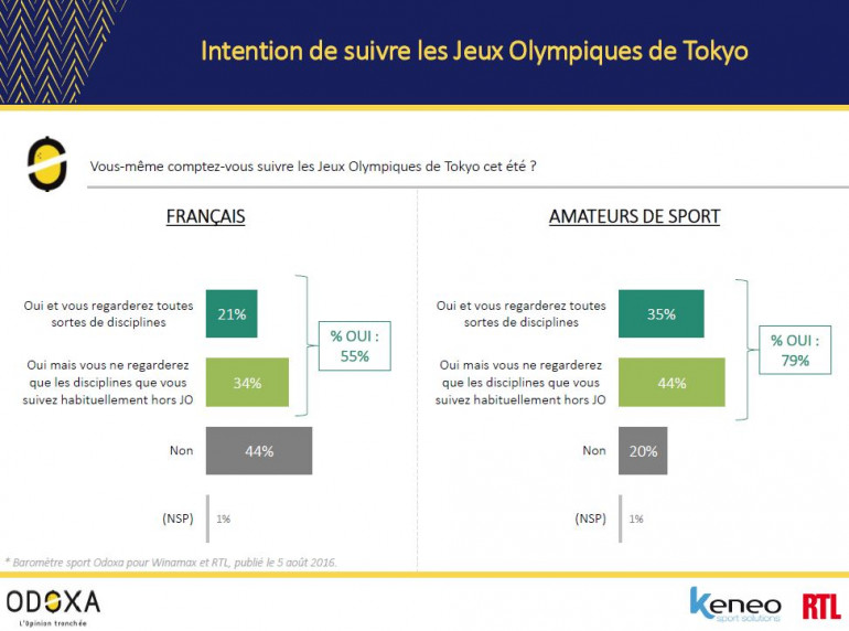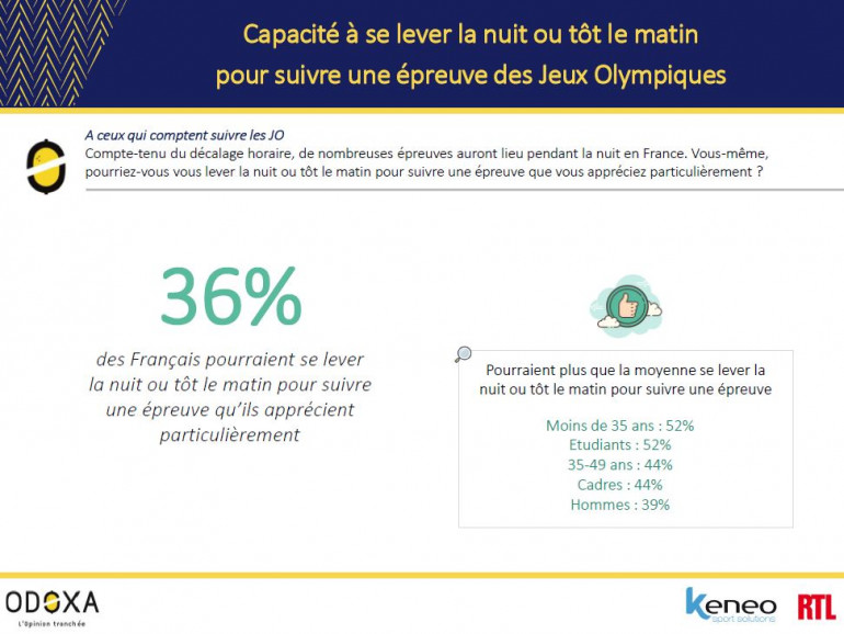 Avec sept heures de décalage horaire, certaines épreuves ayant lieu en matinée à Tokyo seront diffusées durant la nuit en France. Mais cela n’apparaît pas forcément de nature à refréner l’intérêt du public : parmi les Français qui comptent suivre les JO, 36% déclarent qu’ils pourraient se lever la nuit ou tôt le matin pour suivre une épreuve qu’ils apprécient particulièrement.