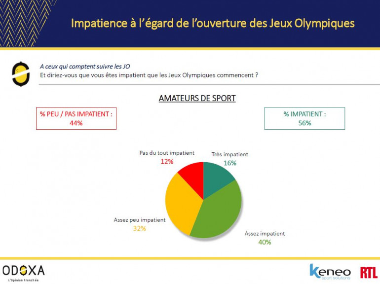 Compte tenu de ce grand intérêt pour cet événement sportif spectaculaire autant que pour ses épreuves passionnantes, les JO sont attendus de pied ferme par le public à un mois de leur cérémonie d’ouverture. 56% des amateurs de sport ayant l’intention de suivre les JO déclarent en effet qu’ils sont impatients qu’ils commencent. 16% sont même très impatients.