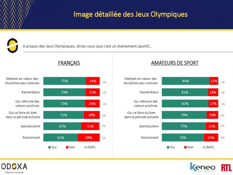 55% des Français et 79% des amateurs de sport ont l’intention de suivre les JO de Tokyo (vendredi 23 juillet-dimanche 8 août). L'événement est particulièrement apprécié des sondés, qui le trouvent rassembleur (74%), spectaculaire (67%), passionnant (61%). La majorité des personnes interrogées estiment que les Jeux véhiculent des valeurs positives (73%) et vont faire du bien dans la période actuelle (71%).
