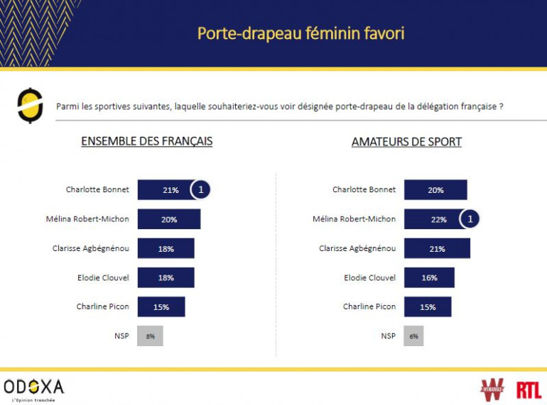 Actuellement, aucun athlète ne se dégage nettement des préférences des Français pour porter le drapeau de la délégation bleu-blanc-rouge parmi les candidats déclarés ou pressentis. Chez les femmes, la nageuse Charlotte Bonnet arrive en première position des souhaits des Français (21%) juste devant l’athlète Mélina Robert-Michon (20%).