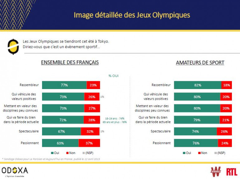 Pour 77% des Français et 82% des amateurs de sport, il s’agit d’un événement sportif rassembleur et pour 73% il véhicule des valeurs positives. Ce rendez-vous régulier des Français avec une multitude d’épreuves (plus de 300 au programme de cet été) est aussi l’occasion de mettre en valeur des disciplines peu connues pour 73% d’entre eux. L’engouement national pour les JO d’été se retrouve également dans l’intérêt exprimé pour cet événement sportif jugé spectaculaire par 67% des Français et 74% des amateurs de sport, ainsi que passionnant par 63% des Français et 76% des amateurs de sport.