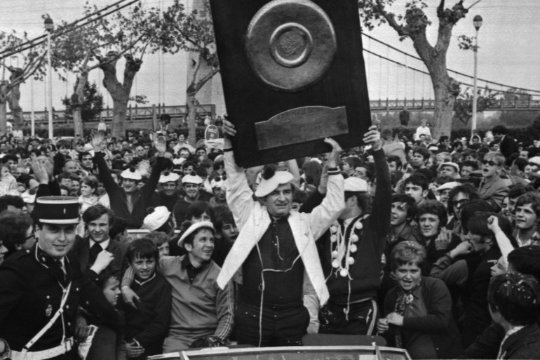 Les joueurs de la Voulte sportif brandissent le Bouclier de Brennus le 19 mai 1970