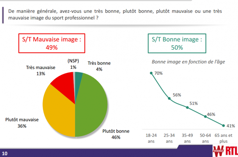 Si plus de la moitié des Français reconnaissent se rendre régulièrement dans une enceinte sportive pour assister à un match ou à une compétition, leur vision du sport professionnel n'est pas forcément positive. En effet, 36% de nos concitoyens ont une image "plutôt mauvaise" de ce milieu, et 13% "très mauvaise", selon un sondage Odoxa réalisé pour RTL et Winamax. À l'inverse, 46% des Français ont une bonne image du sport professionnels, voire une très bonne image, pour 4% de la population. Et plus l'âge augmente, plus la popularité s'effondre. En effet, elle est de 70% chez les 18-24 ans et dégringole à 41% chez les 65 et plus.