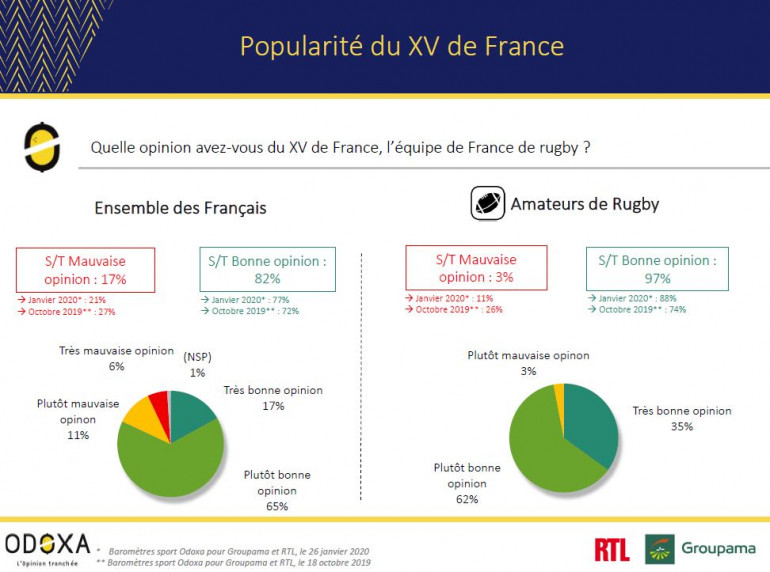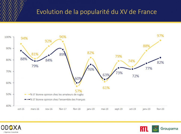 Après une mesure de 77% juste avant le début du Tournoi des VI nations, elle dépasse de nouveau le seuil symbolique des 80%. La victoire surprise face aux Anglais (24-17) en ouverture le 2 février y est sans doute pour beaucoup. Ce sont désormais 82% des Français et même 97% des amateurs de rugby qui ont une bonne image de leur équipe.