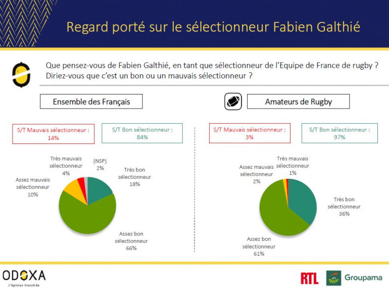 Lui aussi prend les rênes de la sélection après plusieurs années de difficultés, et comme "DD" il est particulièrement apprécié par le public. 84% des Français jugent en effet que c’est un bon sélectionneur. Surtout, les amateurs de rugby sont unanimes : 97% l’estiment bon.