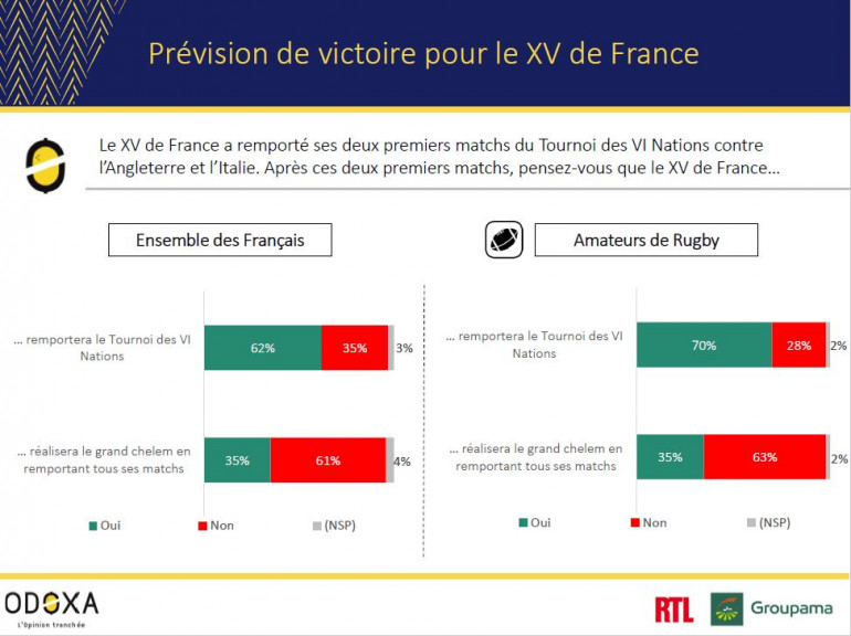 Les Français sont d’ailleurs majoritairement convaincus qu’ils gagneront enfin après 10 ans de disette. Ils sont 62% à le penser et même 70% chez les amateurs de rugby. Ils sont en revanche plus dubitatifs sur un Grand Chelem. 61% des Français et 63% des amateurs de rugby ne pensent pas que les Bleus y parviendront.