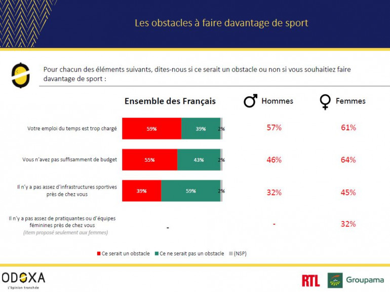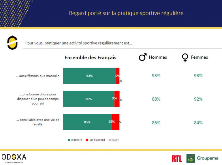 93% les sondés estiment que la pratique d'un sport est aussi féminin que masculin, 90% une bonne chose pour disposer d'un peu de temps pour soi et 85% qu'elle est conciliable avec une vie de famille. Un emploi du temps trop chargé, un budget trop serré et un manque d'infrastructures peuvent être des obstacles.