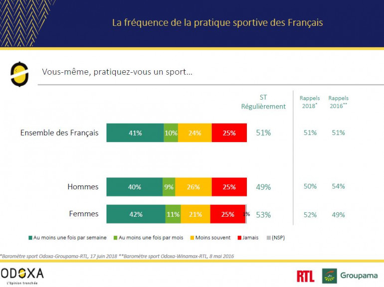 En 2018, les courbes s’étaient croisées : 52% des femmes faisaient du sport au moins une fois par mois contre 50% des hommes. La tendance se poursuit. 53% d’entre elles font du sport au moins une fois par mois quand ils ne sont plus que 49%. Les sportives régulières (au moins une fois par semaine) sont aussi légèrement plus nombreuses (42%) que leur homologues masculins (40%).