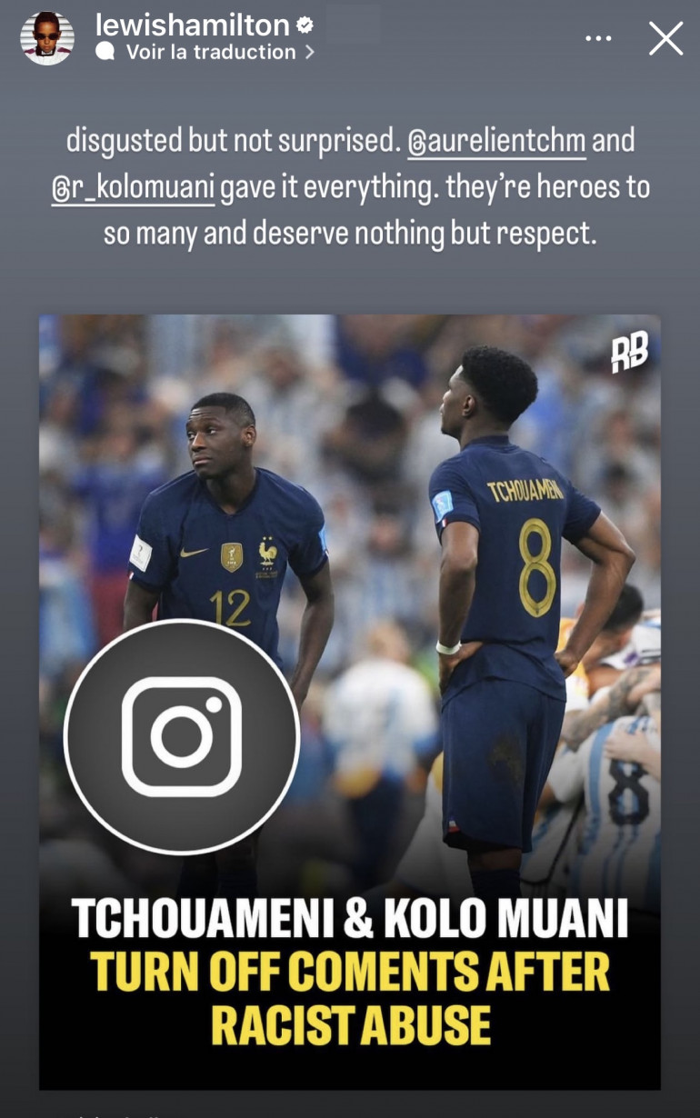 Porte-voix pour le mouvement Black Lives Matter et très engagé contre de racisme, le Britannique Sir Lewis Hamilton a publié mercredi 21 décembre une story Instagram sur laquelle apparaît une photo des deux joueurs de l’équipe de France avec de message : « Ecœuré mais pas surpris. Aurélien Tchouaméni et Randal Kolo Muani ont tout donné. Ce sont des héros pour beaucoup de gens et ils ne méritent que du respect. »