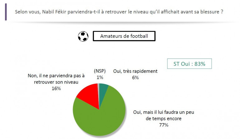 La dernière question concerne à nouveau l'Olympique Lyonnais, et plus précisément son attaquant Nabil Fékir. Gravement touché au genou droit en septembre 2015, le joueur de 23 ans peine à retrouver son meilleur niveau. Y parviendra-t-il dans les prochaines semaines ? Oui, répondent massivement les sondés. Mais il lui faudra un peu de temps pour 77% d'entre eux.