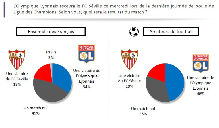 Selon vous, quel sera le résultat de ce Lyon-Séville ? Voici la première des quatre questions posées à un échantillon de 945 personnes représentatif de la population française âgée de 18 ans et plus, sur internet les 1er et 2 décembre. À 64%, les sondés pronostiquent une élimination lyonnaise (19% une victoire du club andalou, 45% un match nul). Les amateurs de football sont un peu plus optimistes : 46% contre 34% de l'ensemble des Français croient en une victoire des Gones.