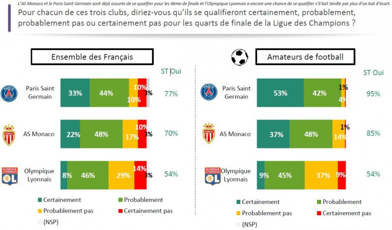Dans l'hypothèse, toutefois, d'une qualification du club de Jean-Michel Aulas, une courte majorité de Français, 54%, le voit franchir ces 8es de finale. Pour le PSG et Monaco, la proportion grimpe respectivement à 77% et 70%. Parmi les amateurs de ballon rond, cela ne fait quasiment aucun doute, Paris sera en quarts (95% des sondés l'envisagent). Monaco jouit également d'un bon pré-sentiment (80%).