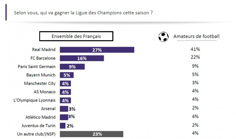 Et à la fin, le 3 juin 2017 à Cardiff, qui soulèvera la "Coupe aux grandes oreilles" ? Les deux plus grands clubs espagnols, le Real Madrid (27%) et le FC Barcelone (16%), arrivent largement en tête. Ce sont d'ailleurs les deux derniers lauréats. Petite surprise, le Paris Saint-Germain arrive en troisième position, pour l'ensemble des Français (9%) comme pour les amateurs (9% également). Monaco et Lyon ne sont pas très loin : à la sixième place, derrière le Bayern Munich mais à égalité avec Manchester City.