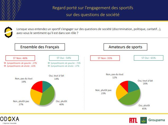 Mais les prises de position des sportifs restent clivantes auprès de la population, notamment en termes politiques. Elles sont ainsi largement approuvées chez les sympathisants de gauche (73%) quand les sympathisants de droite jugent à 63% que les sportifs ne sont pas dans leur rôle lorsqu’ils s’engagent sur des questions de société.