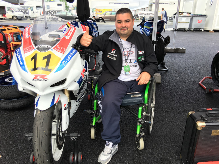 Voilà comment ce Lillois décide de jouer la carte de la sécurité et d'aller, dès 2012, rouler uniquement sur circuit. Mais un an plus tard la Fédération Française de Motocyclisme (FFM), lui interdit l'accès aux courses des valides. Il créé alors sa propre structure et met sur pied la PMR Cup, ouverte aux Personnes à Mobilité Réduite. "Mon but était d'aider les pilotes blessés à remonter en selle sur des motos adaptées à leur handicap. Sur la mienne, j'ai mis les commandes de vitesse et le frein au guidon, et comme je ne peux pas bouger mes jambes, mes bottes sont prises dans un système de cale-pied."