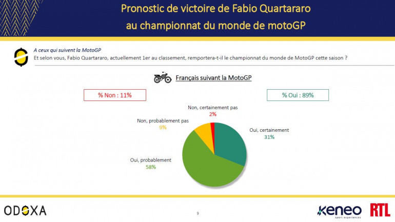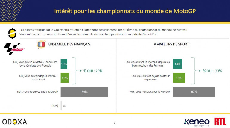 Alors qu'ils ne sont d'ordinaire que 13% à suivre ce championnat, les Françaises et les Français sont désormais 23% à se tenir informés des résultats de leur deux représentants. Ils sont par ailleurs 89% à pronostiquer le sacre mondial de Fabio Quartararo ; 31% en sont