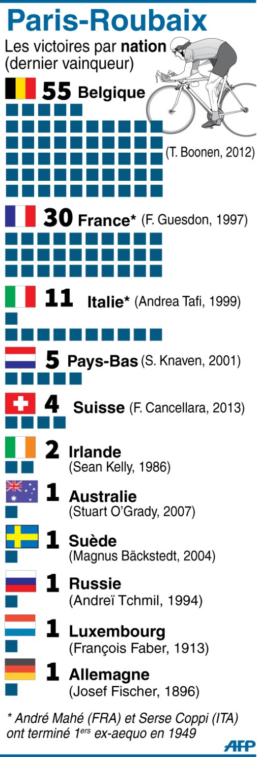 Le Néerlandais Niki Terpstra (Omega Pharma) a remporté en solitaire Paris-Roubaix, la "reine des classiques" cyclistes, longue de 257 kilomètres, dimanche. Terpstra a battu de 20 secondes un groupe de poursuite, réglé pour la deuxième place par l'Allemand John Degenkolb. Le Suisse Fabian Cancellara, grand favori au départ de Compiègne, a pris la troisième place devant le Belge Sep Vanmarcke et le Tchèque Zdenek Stybar. Terpstra s'était classé troisième l'année passée derrière Cancellara et Vanmarcke.