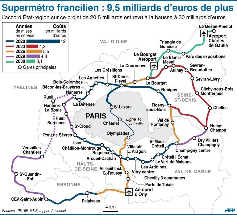 Carte du réseau de transport du Grand Paris à l'horizon 2030
