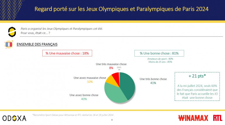 Un plébiscite après le doute : 81% des Français jugent que les Jeux olympiques et paralympiques 2024 de Paris étaient une bonne chose alors qu’ils n’étaient que 60% à les soutenir à la mi-juillet. Non seulement 77% des Français considèrent que les Jeux ont permis de se rassembler après une période de division, mais ils ont aussi décidé près de 3 sur 10 d’entre eux à faire plus de sport (29%) et à essayer une discipline qu’ils ont suivi pendant la compétition (27%).