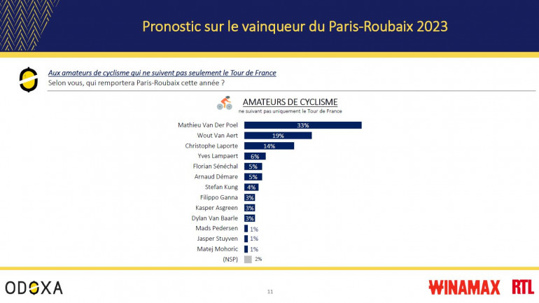 Pour 78% des amateurs de cyclisme, "l’Enfer du Nord" n’a pas d’équivalent dans la saison, c’est même la course la plus dure pour 72% d’entre eux et la plus spectaculaire pour 71%. Pour cette édition 2023, le Néerlandais Mathieu Van der Poel apparaît comme le grand favori (33% de citations) devant le Belge Wout Van Aert (19%) et le Français Christophe Laporte (14%).