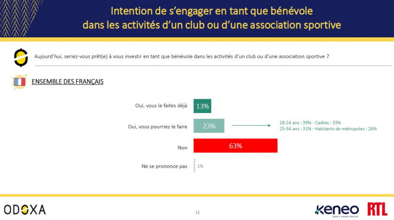 En effet, alors que 13% d’entre eux se déclarent déjà investis en tant que bénévoles dans les activités d’un club ou d’une association sportive, 23% disent qu’ils pourraient le faire, et ils sont même 39% chez les 18-24 ans, 33% chez les cadres, 31% chez les 25-34 ans et 26% parmi les habitants de métropoles.
