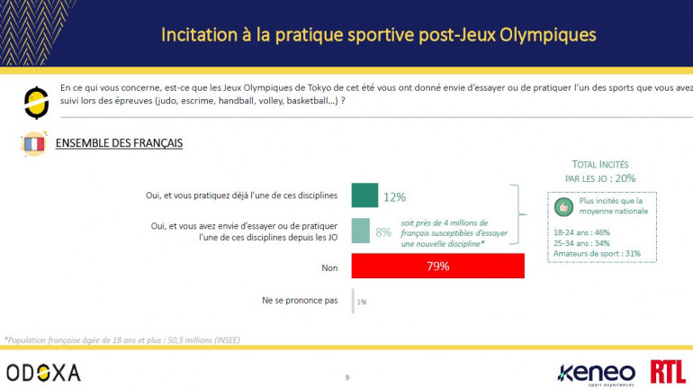 Cet intérêt significatif pour la manifestation sportive la plus suivie dans le monde semble aussi avoir généré une dynamique sportive nationale : 20% des Français (et même 46% des 18-24 ans et 34% des 25-34 ans) déclarent que les JO de Tokyo leur ont donné envie d’essayer ou de pratiquer l’un des sports qu’ils ont suivi lors des épreuves. Parmi ceux-ci, 12% déclarent qu’ils pratiquent déjà cette discipline et 8% qu’ils ont envie de l’essayer ou de la pratiquer, soit potentiellement 4 millions supplémentaires de pratiquants.