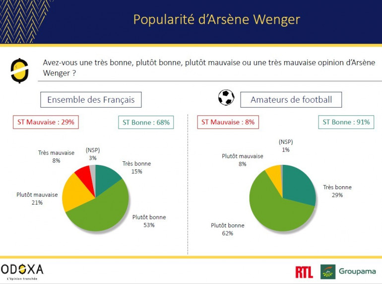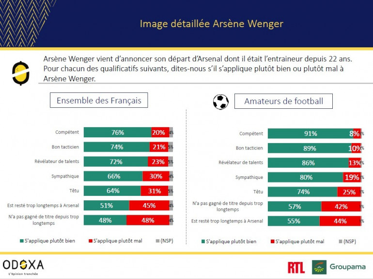 Les Françaises et les Français ont largement une bonne image d'Arsène Wenger. Chez les amateurs de football, c'est une quasi unanimité. Le futur-ex-manager d'Arsenal est perçu comme quelqu'un de compétent, bon tacticien, révélateur de talents, mais aussi comme un individu têtu, qui n'a pas gagné de titre depuis trop longtemps. Ferait-il un bon directeur sportif du PSG ? Un bon sélectionneur des Bleus ? Oui, répondent globalement les sondés.