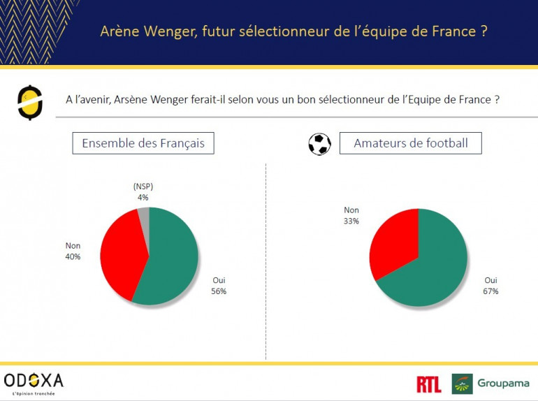 Constat similaire lorsqu'on évoque la possibilité de voir Wenger prendre la succession de Didier Deschamps. L'hypothèse séduit majoritairement. Pour 56% des Français et 67% des amateurs, Wenger ferait un bon sélectionneur de l’Équipe de France